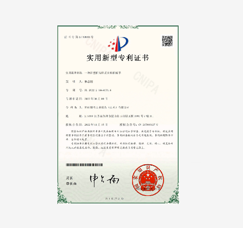 恭喜我司新增专利一种注塑机齿轮式夹料机械手
